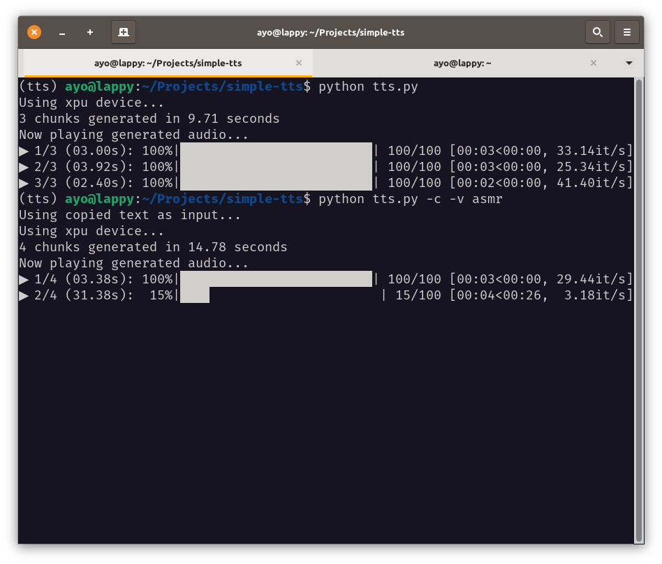 python tts.py --device xpu # will use the Intel GPU